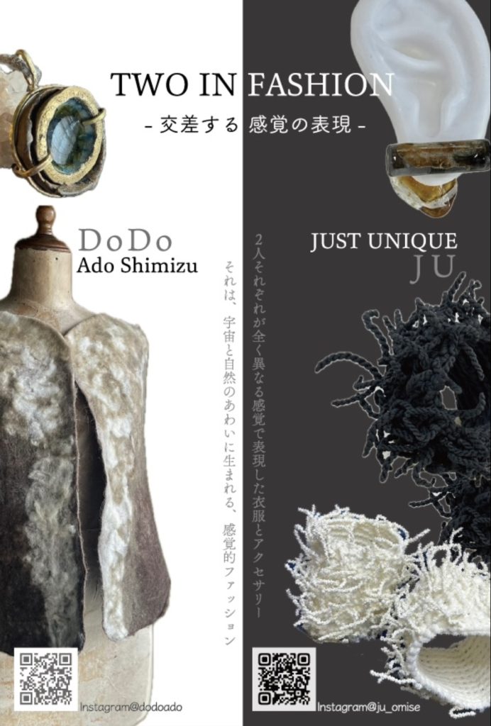 TWO IN FASHION -交差する感覚の表現-DoDo- Ado Shimizu JU- JUST UNIQUE二人展 2人それぞれが全く異なる感覚で表現した衣服とアクセサリーそれは、宇宙と自然のあわいに生まれる、感覚的ファッション 2025年12月1日(mon)〜6日(sat)11時〜19時(最終... -